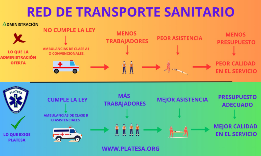 En los últimos años, la realidad del transporte sanitario en Andalucía ha evidenciado una gran contradicción: la ley establece una cosa, pero la Administración ofrece otra muy distinta. Desde PLATESA, la Plataforma de Técnicos en Emergencias Sanitarias de Andalucía, hemos querido plasmar esta situación en una infografía clara y directa.